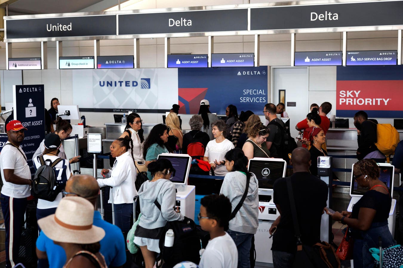 Travelers wait in line at a Delta Airlines counter at Ronald Reagan National Airport (DCA) in Arlington, Virginia, United States Professional Photographer: Ting Shen/Bloomberg