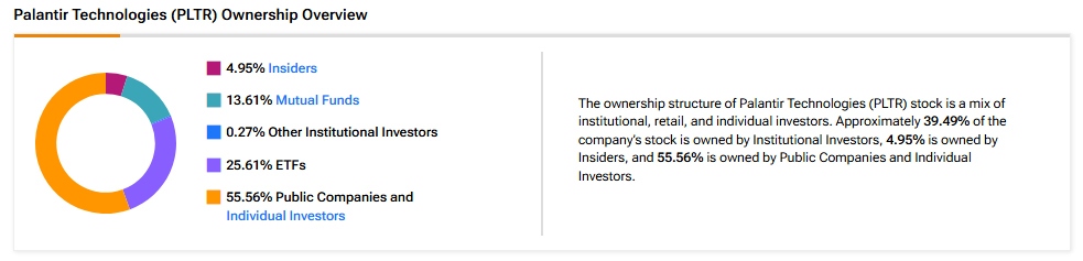 Now, according to TipRanks’ ownership page, public business and private financiers own 55.56% of PLTR. They are followed by ETFs, shared funds, experts, and other institutional financiers, at 25.61%, 13.61%, 4.95%, and 0.27%, respectively.