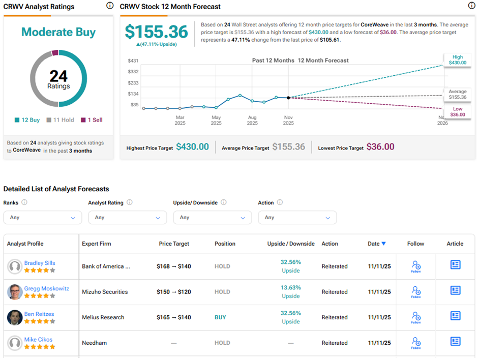 On TipRanks, CRWV has a Moderate Buy agreement score based upon 12 Buys, 11 Holds, and one Offer score. The typical CoreWeave rate target of $155.36 indicates 47.1% upside possible from existing levels. Year-to-date, CRWV stock has actually risen over 184%.