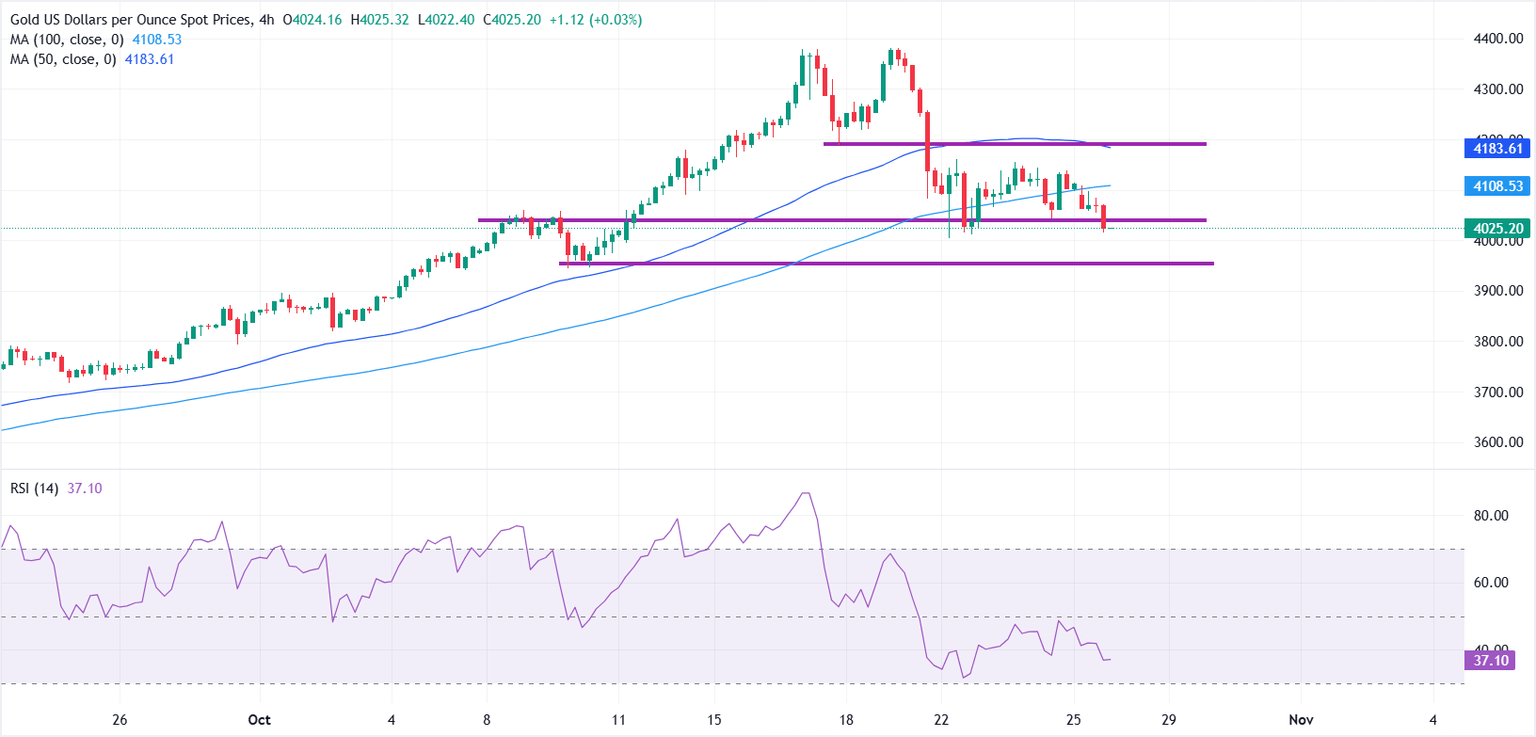 Gold bears stay in control as rates have a hard time to hold above the $4,000 mental mark. The metal continues to trade listed below the 50- and 100-period Simple Moving Averages (SMAs) near $4,187 and $4,107, revealing that sellers have the upper hand.