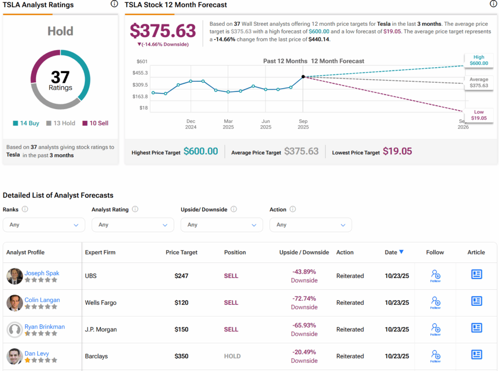 Turning to Wall Street, experts have a Hold agreement ranking on TSLA stock based upon 14 Buys, 13 Holds, and 10 Sells appointed in the previous 3 months, as suggested by the graphic listed below. Moreover, the typical TSLA rate target of $375.63 per share indicates 14.7% drawback danger.