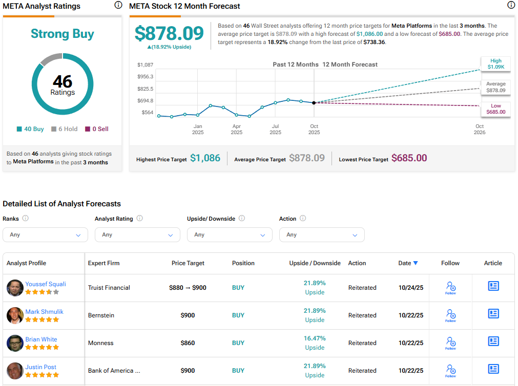 With 40 Buys and 6 Holds, Wall Street has a Strong Buy agreement score on Meta Platforms stock. The typical META stock cost target of $878.09 suggests 19% upside prospective. Meta stock has actually increased 26% year-to-date.