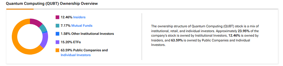 Now, according to TipRanks’ ownership page, public business and specific financiers own 63.59% of QUBT. They are followed by ETFs, experts, shared funds, and other institutional financiers at 15.20%, 12.46%, 7.17%, and 1.58%, respectively.